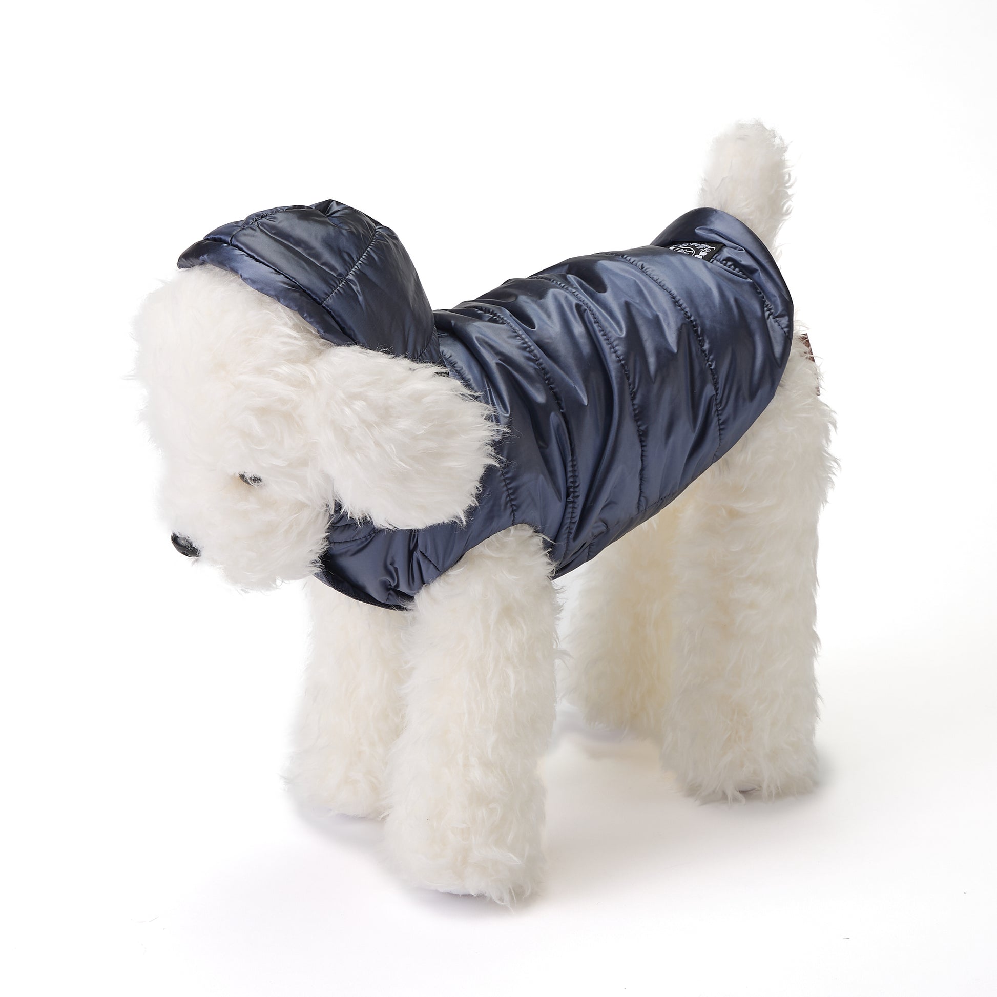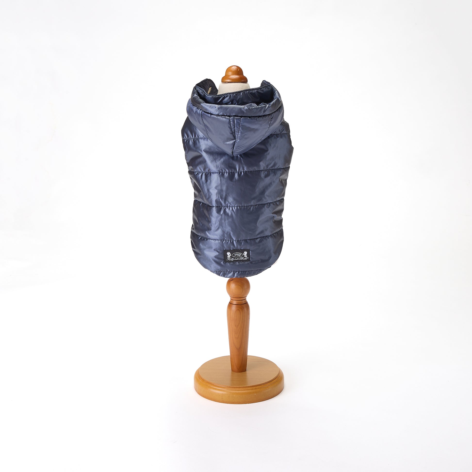 お散歩やお出かけの防寒に便利なコートです。光沢のある生地を使用しており、取り外し可能なフードのボタンにはブランドのロゴが入っています。正面はマジックテープになっており着脱しやすいお作りです。