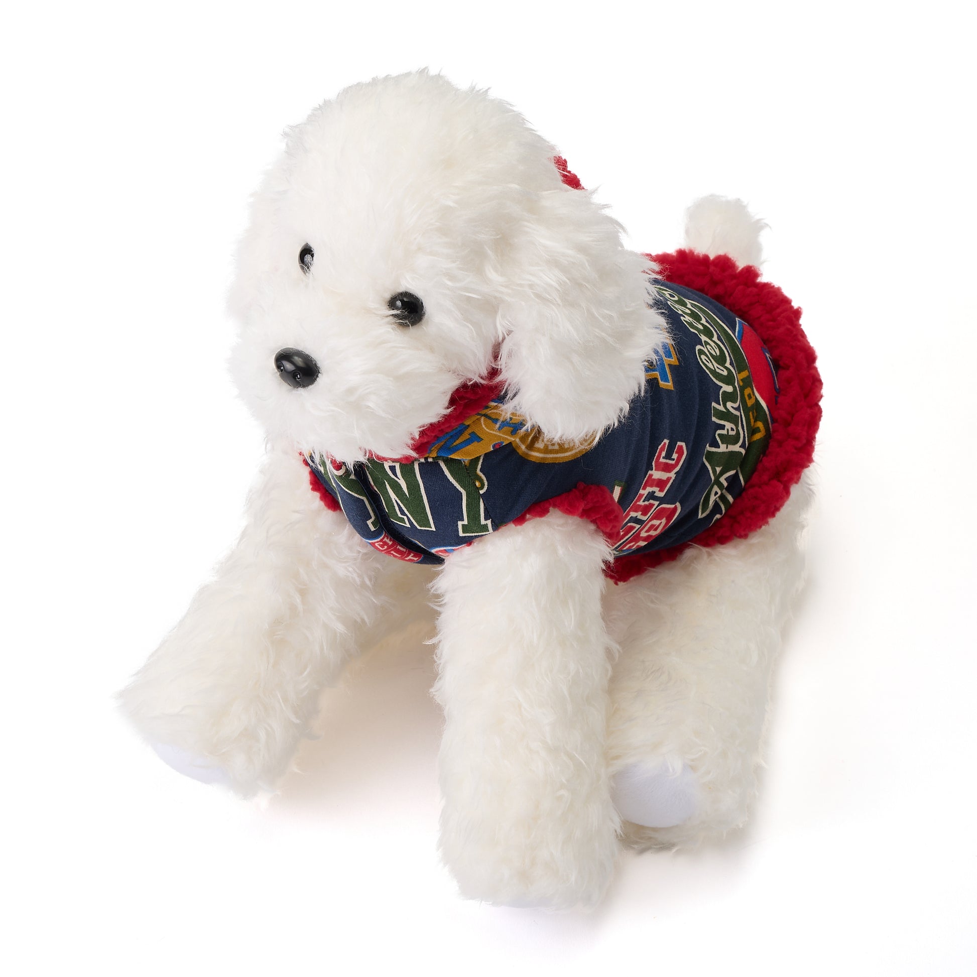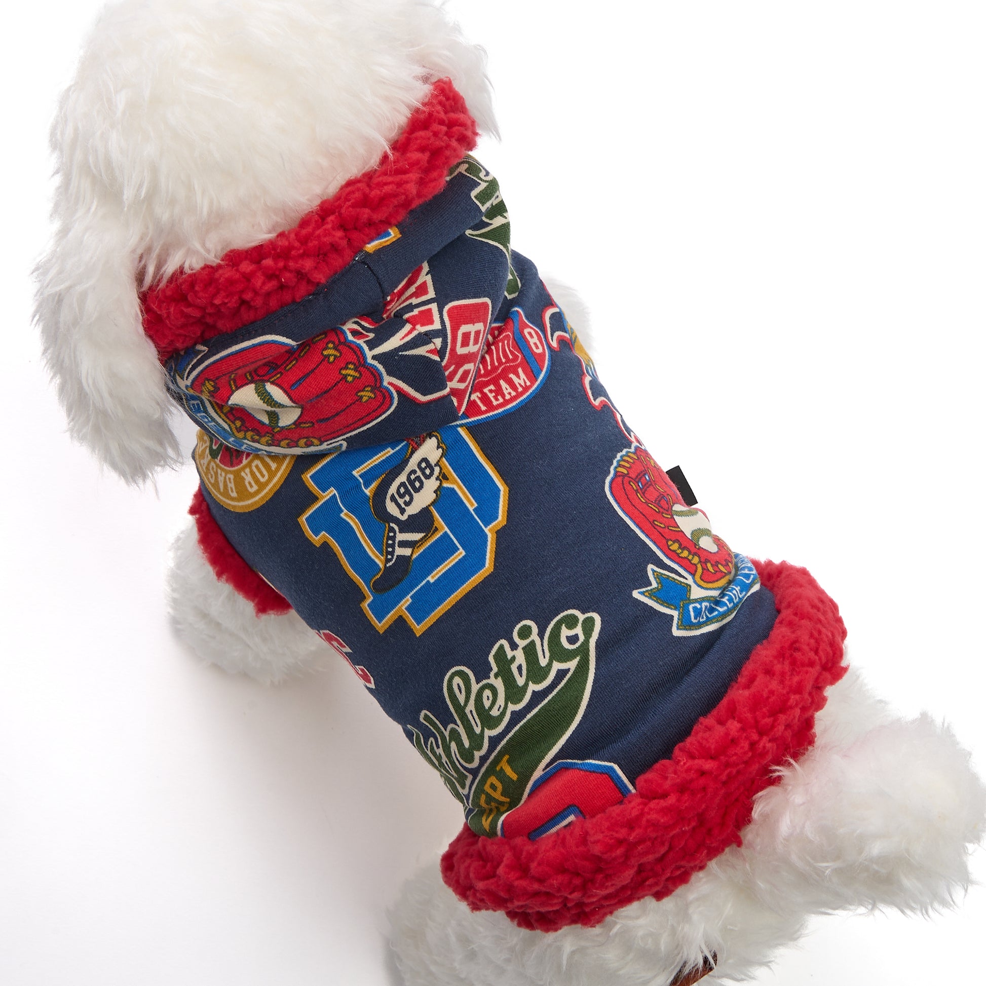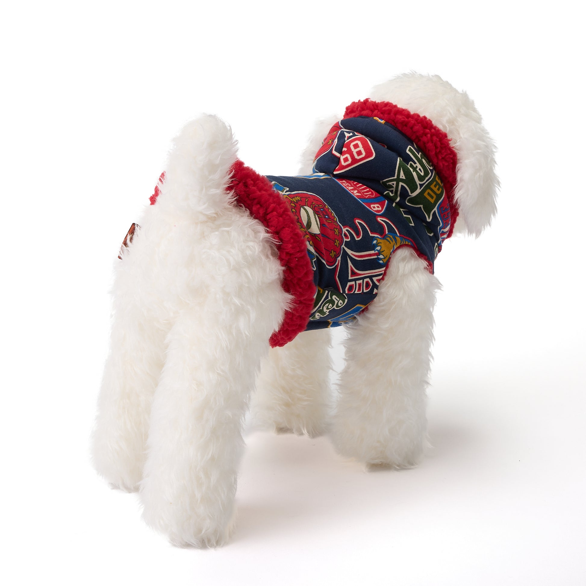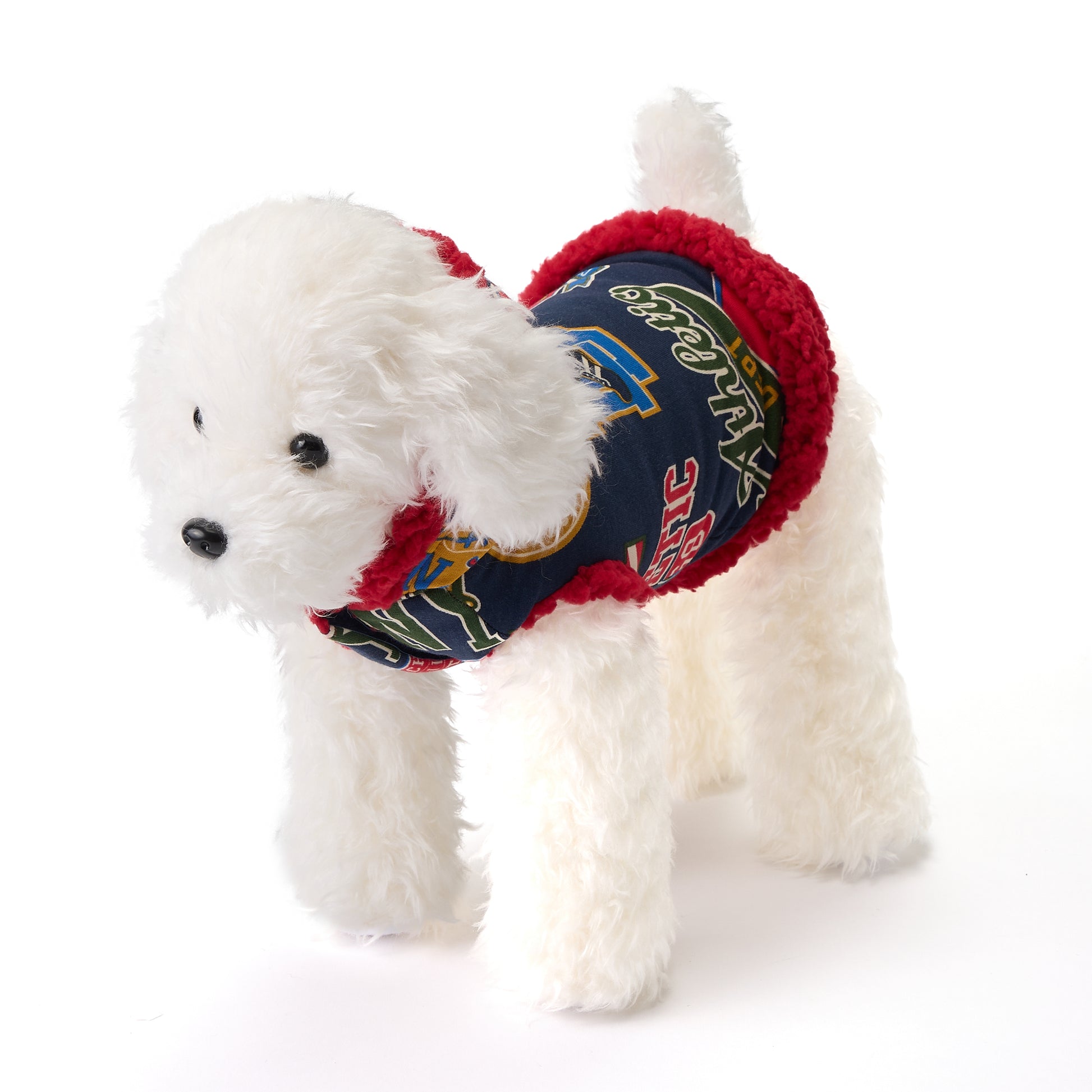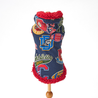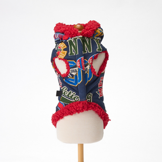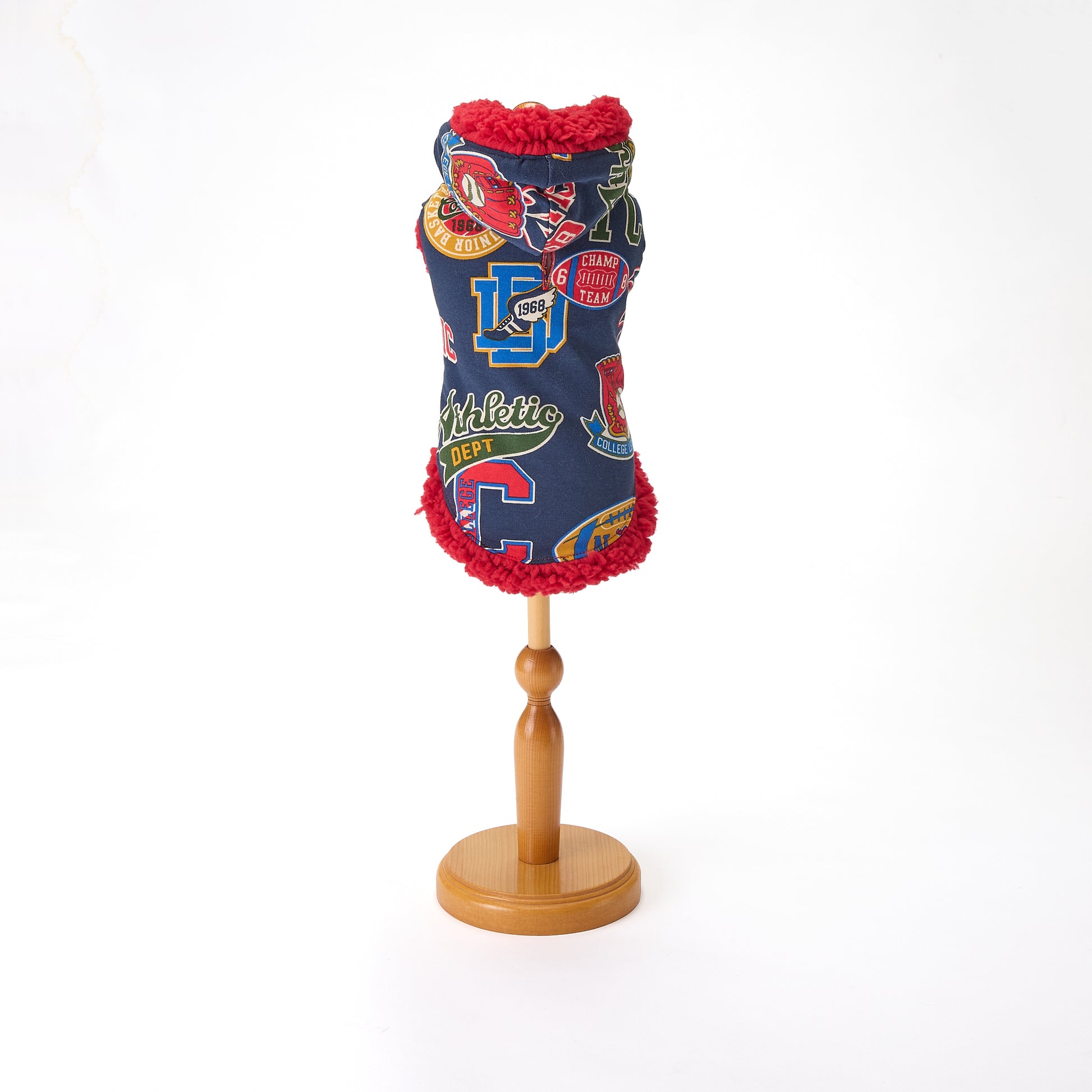 ワッペンがいくつもついているような目を引く柄が印象的です。内側やフード内面はモコモコとしていて見た目にも暖か。お散歩やお出かけの防寒に便利なコートです。背面にリードを通せるホールが空いています。リバーシブルで着ていただけます。