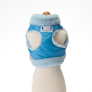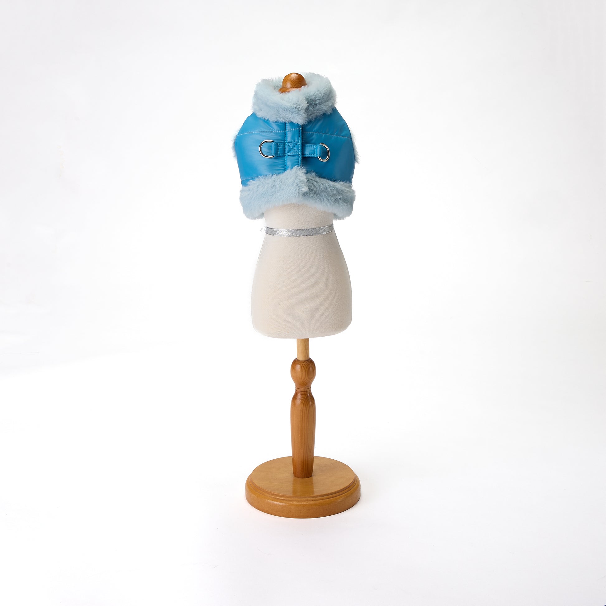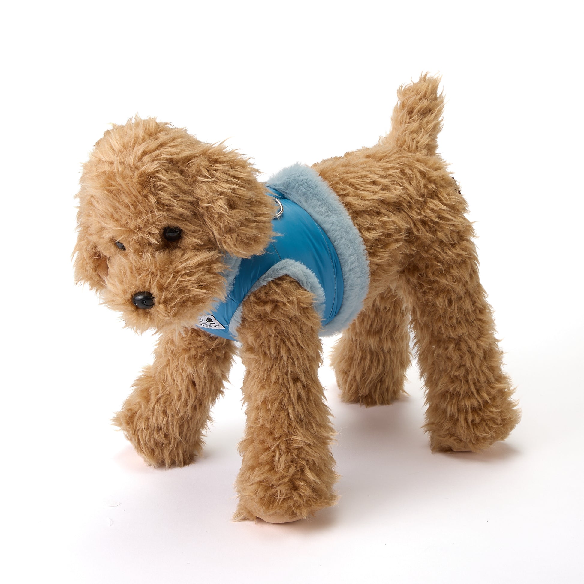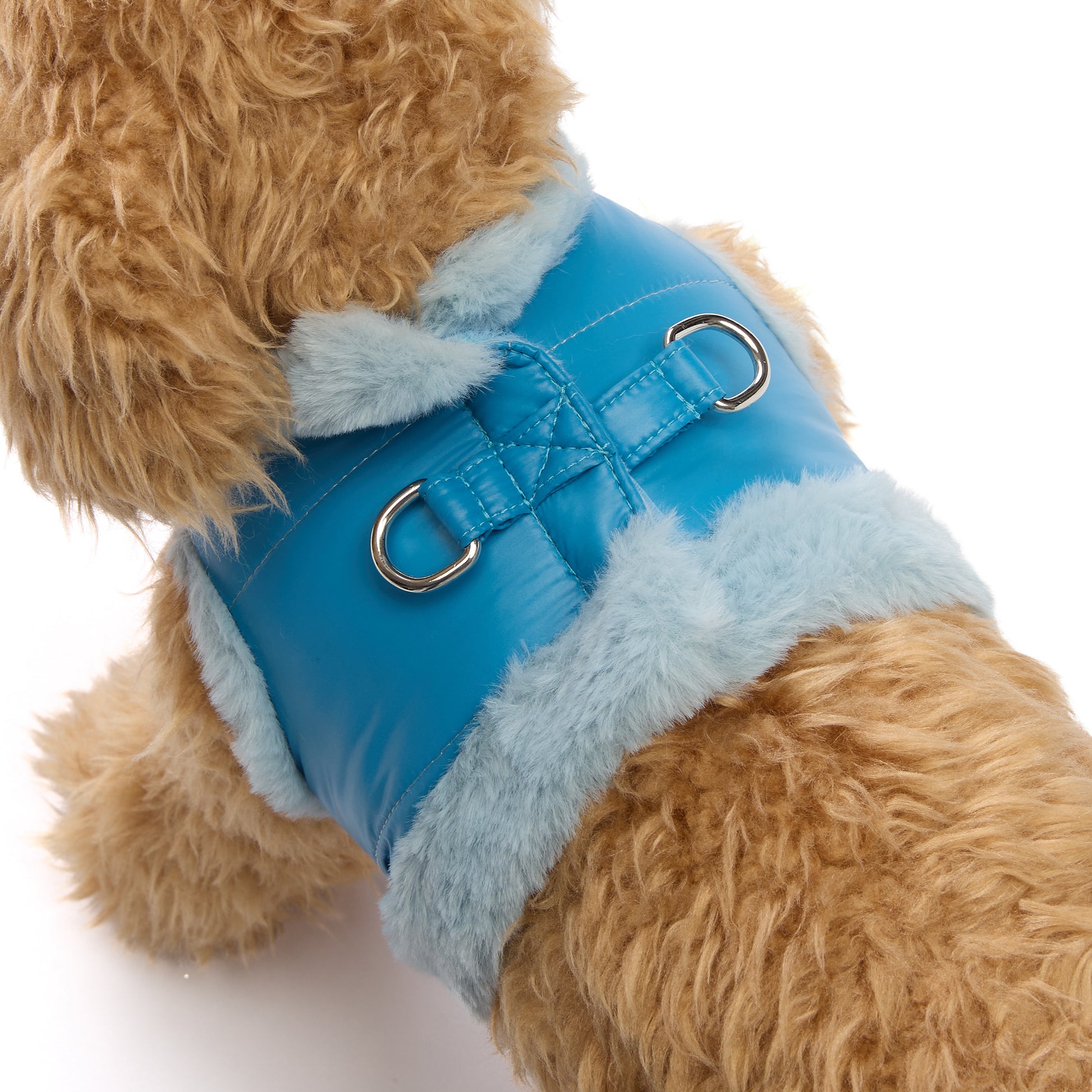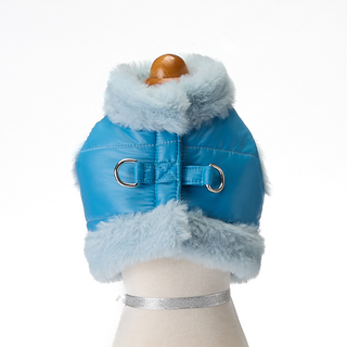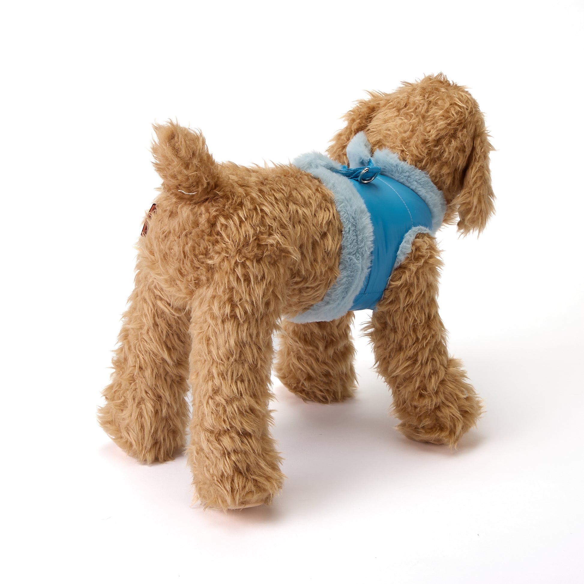 ボディは薄手のダウンコートのような柔らかくつるっとした生地で、襟元と裾にファーのついたハーネスとリードのセットです。