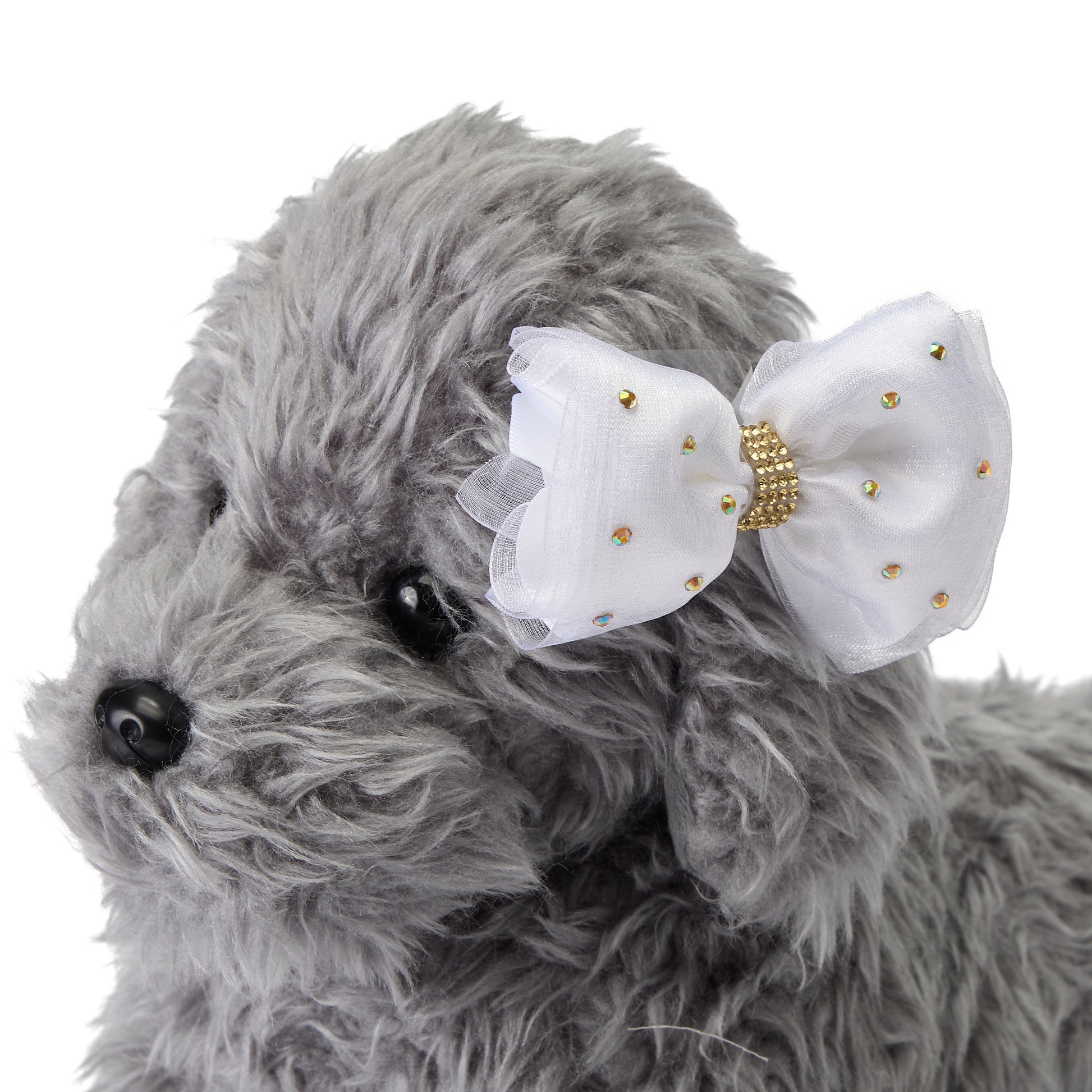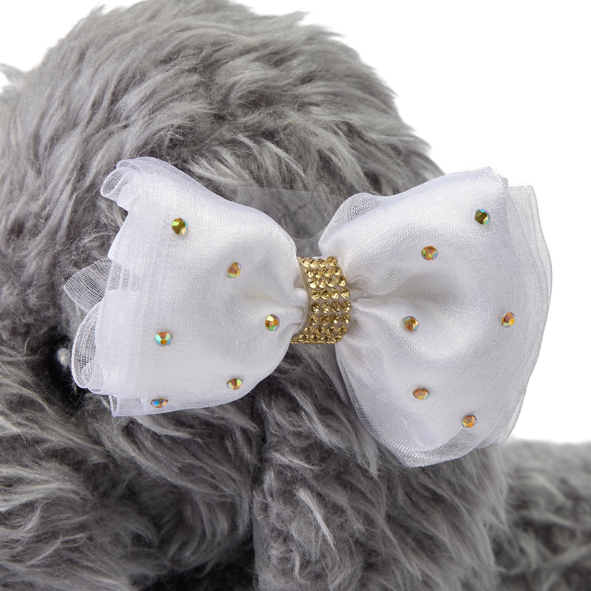 ホワイトの生地にゴールドのドットが華やかなリボンです。どんなお洋服にも合わせやすく、着けるだけで華やかな雰囲気にしてくれます。