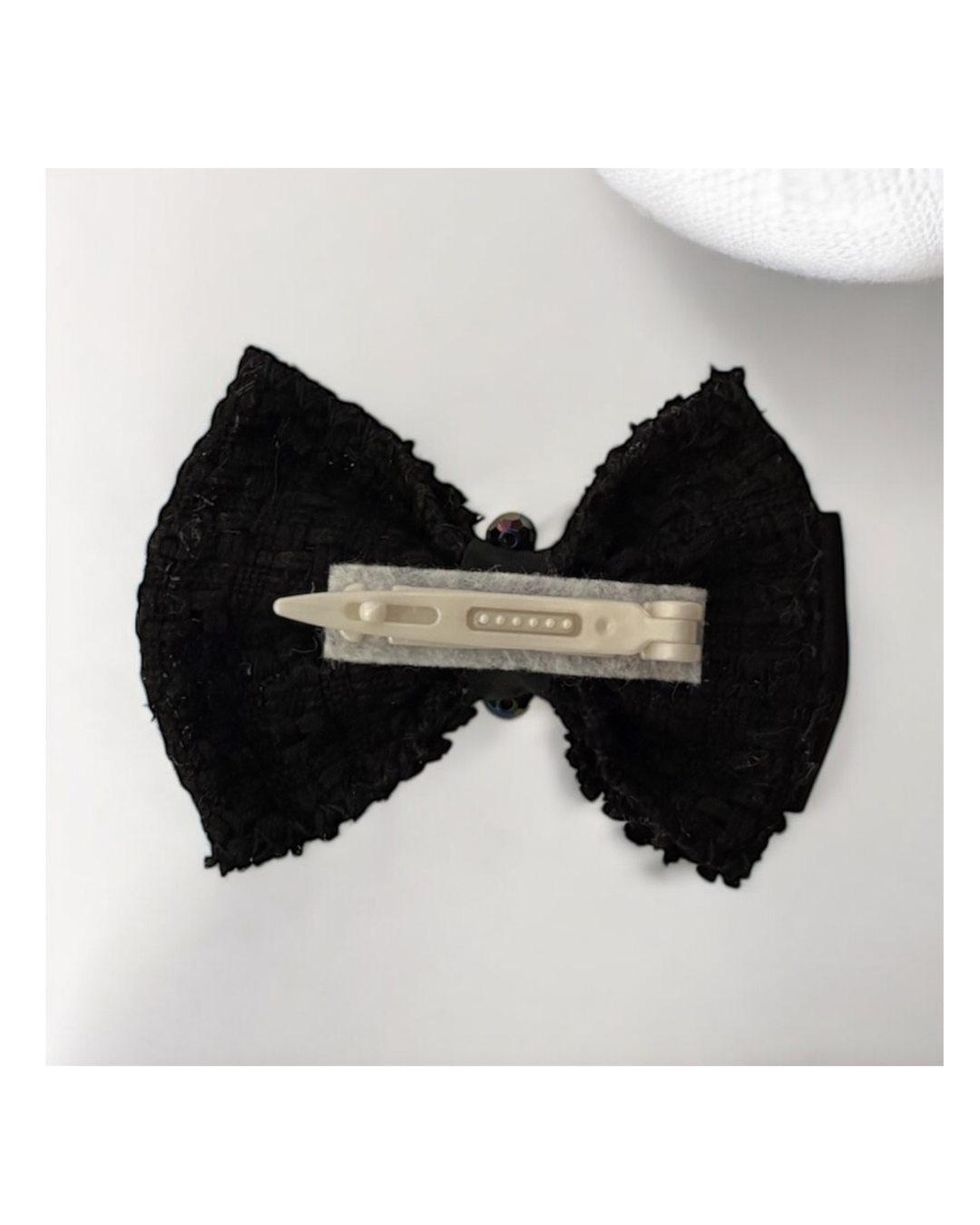 ツイードにサテンのダブルリボンをかさね、中央にはブラックのビーズが並ぶ大人可愛いヘアリボンです。